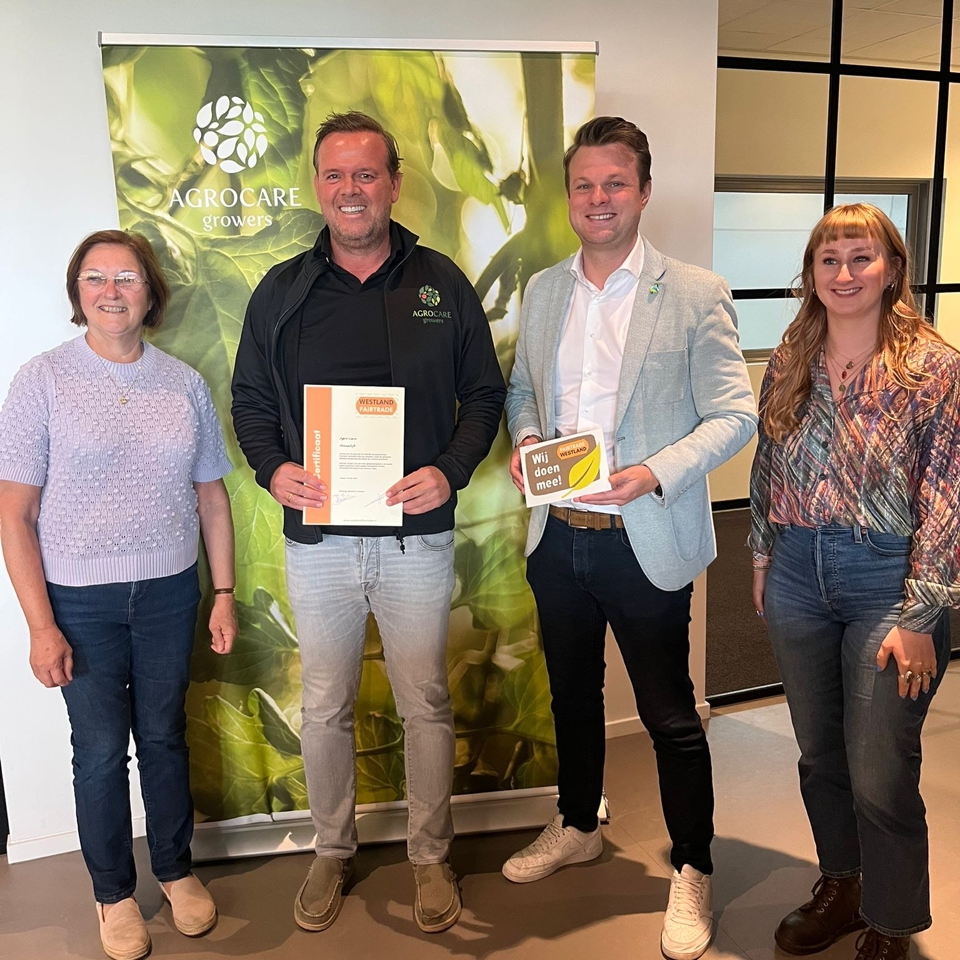 Wethouder Peter Valstar heeft onlangs met trots het Fairtrade-certificaat overhandigd aan Kees van Veen, CEO van Agro Care. Daarmee mag gemeente Westland zich ook de komende twee jaar een officiële Fairtrade Gemeente blijven noemen!